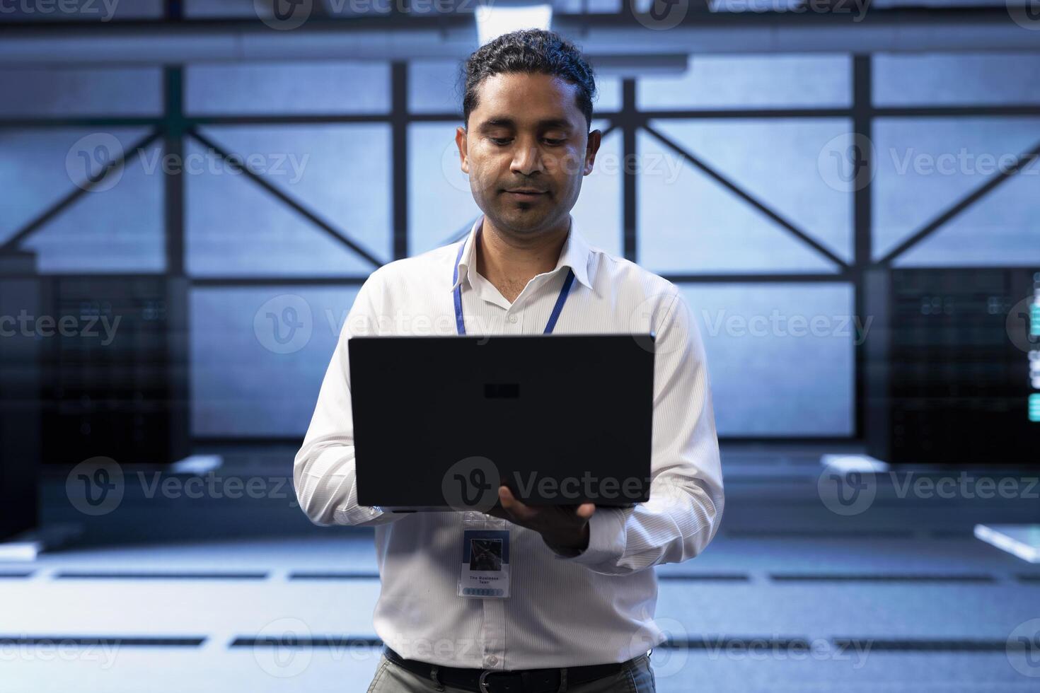 Engineer in server farm checking recovery plan on laptop, monitoring data center energy consumption across components, making sure sensors are functioning optimally, doing maintenance on equipment Pro Photo