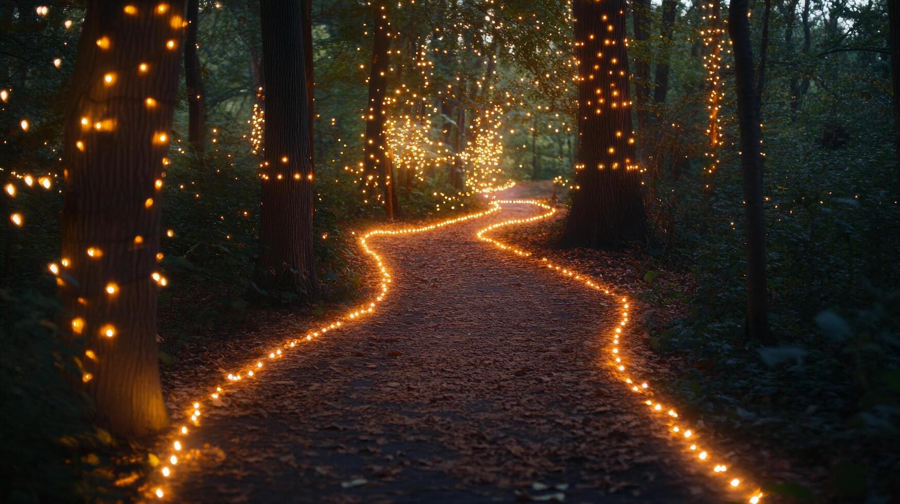 Serene winding path illuminated by fairy lights in a tranquil forest during twilight hours photo