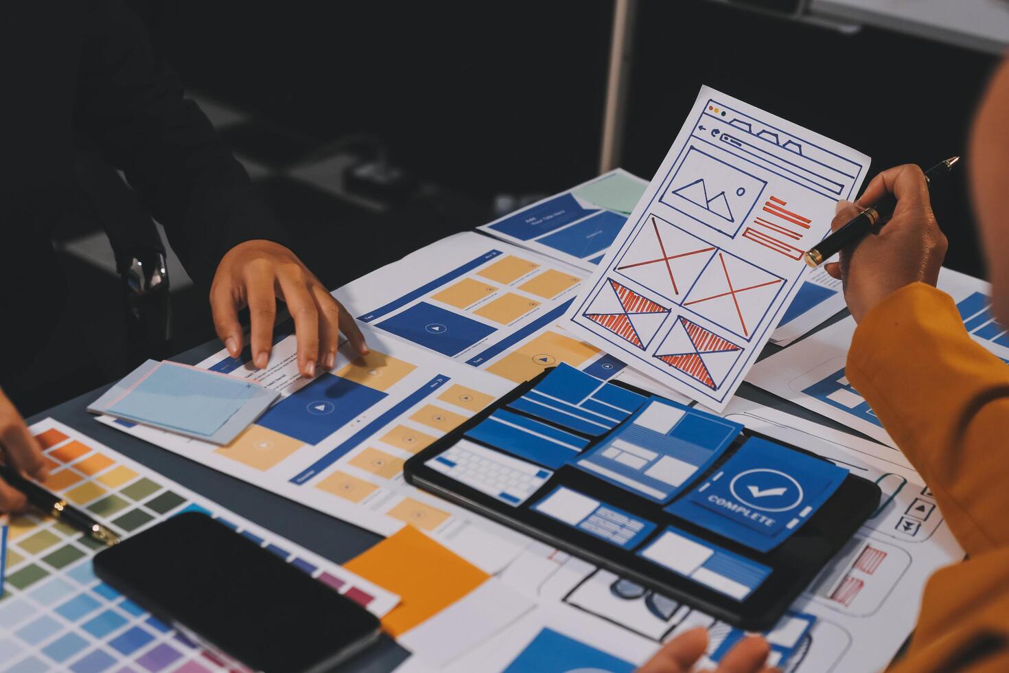 The designer team is designing the uxui system to make the uxui system work well on new phones and support system updates. Website development concept UI UX front end designer Free Photo