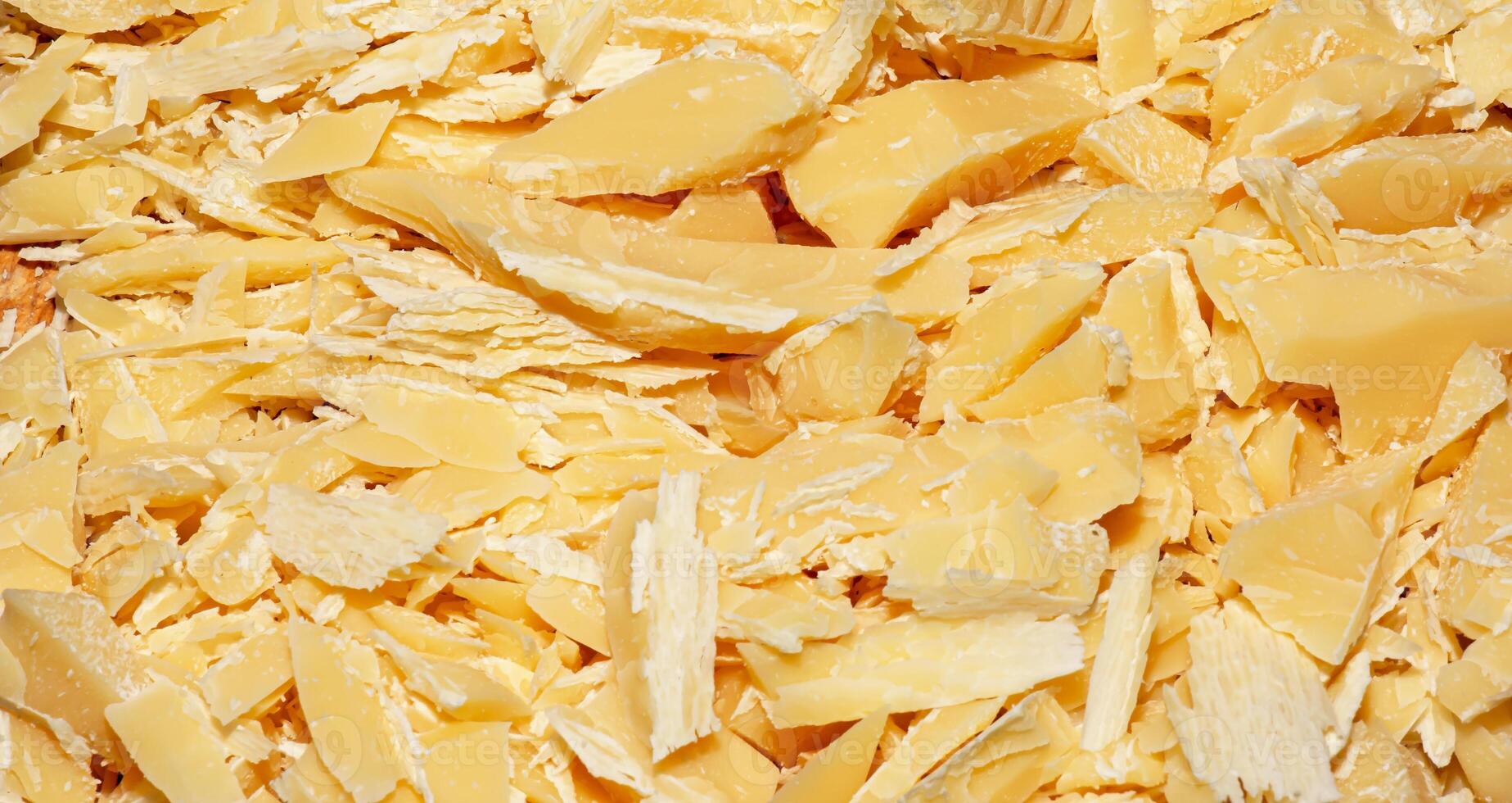 Cocoa butter background, top view, texture. Cocoa butter is one of the ingredients in making chocolate at home. Close-up of crushed cocoa butter, top view. Pro Photo