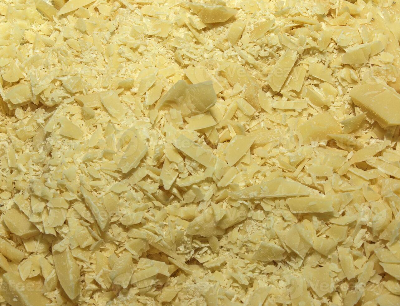 Cocoa butter background, top view, texture. Cocoa butter is one of the ingredients in making chocolate at home. Close-up of crushed cocoa butter, top view. Pro Photo