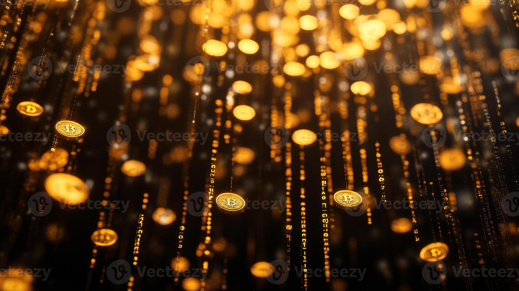 An artistic representation features gold coins cascading against a backdrop of binary code, symbolizing the rich realm of digital wealth and the revolutionary blockchain technology in finance Pro Photo