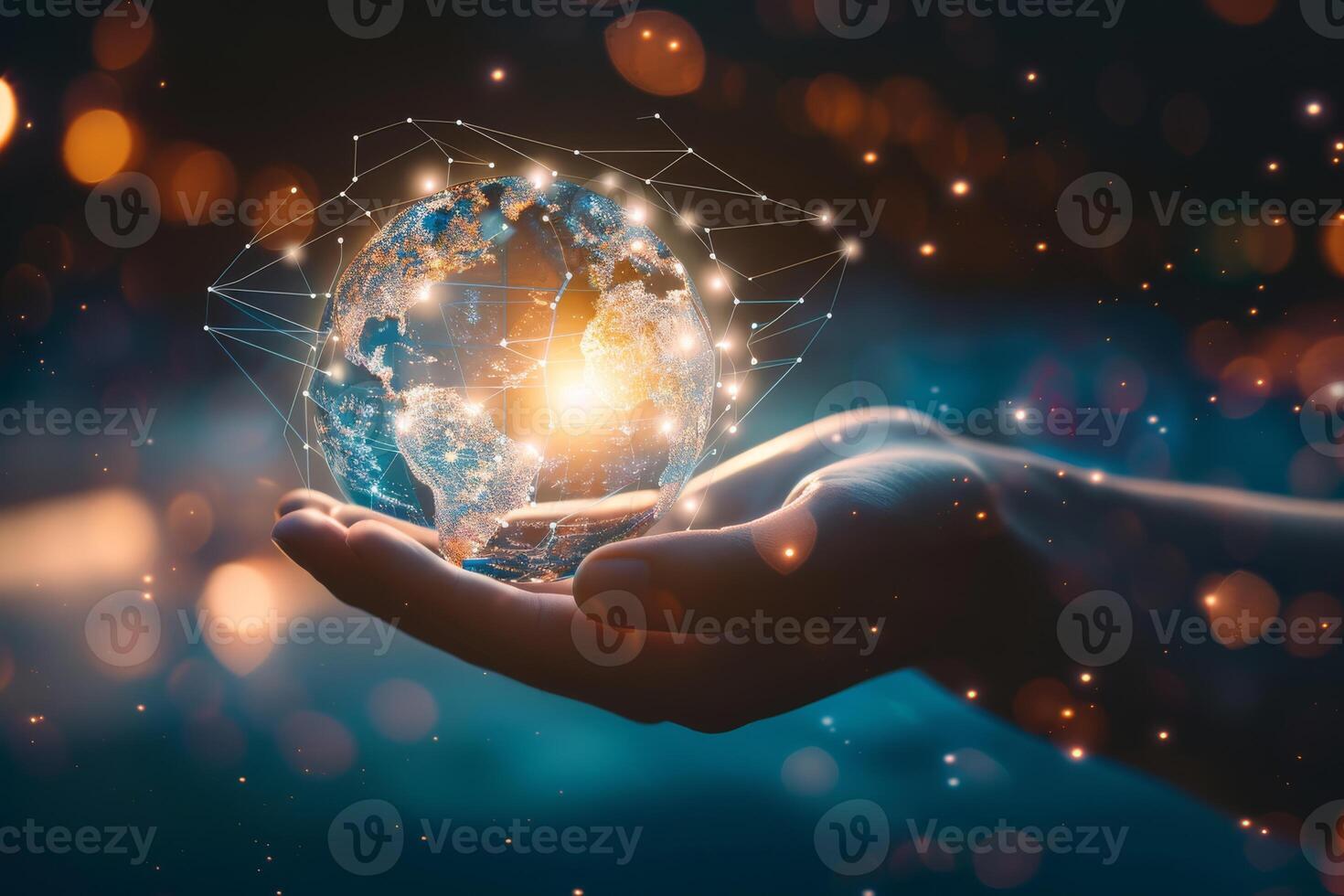 Hand presenting glowing digital globe with network connections, symbolizing technology and innovation. Pro Photo