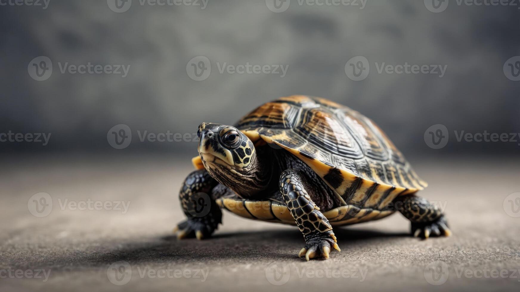 A close-up of a turtle on a textured surface, showcasing its intricate shell patterns. Pro Photo