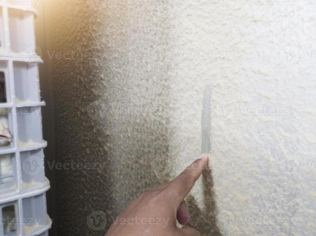 An engineer is checking the thickness of the feather dust on the hatching machine using his index finger. Pro Photo