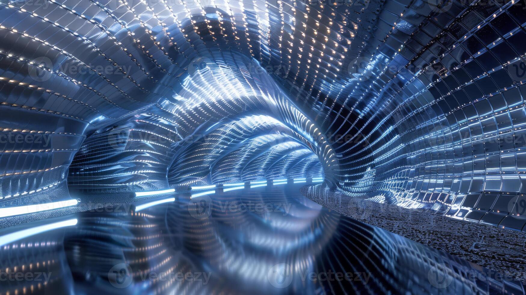 Abstract view of a digital cyberspace tunnel, illuminated with glowing lights and reflecting surfaces. Pro Photo