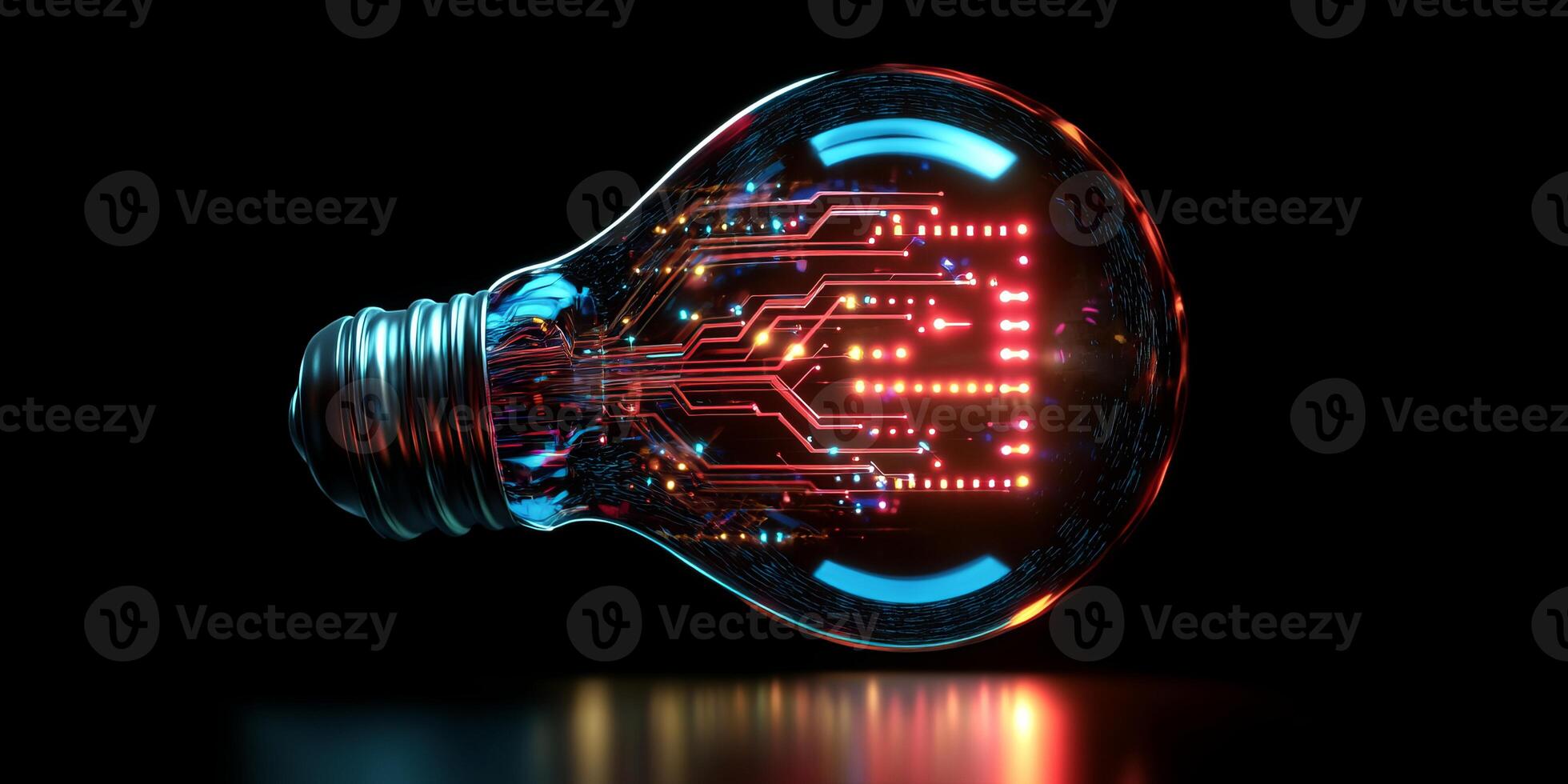 This captivating image of a unique light bulb showcases glowing microcircuitry against a dark background, symbolizing advanced technology and ongoing innovation in our modern world Pro Photo