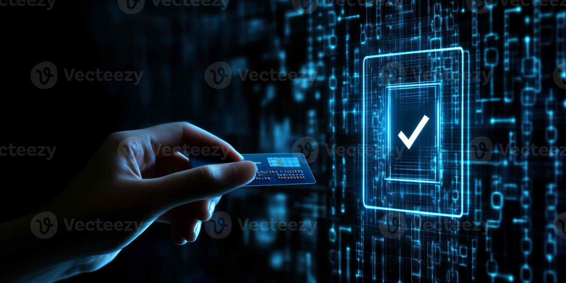 An individual is confirming an online payment with their credit card on a secure interface displaying a verification tick, indicating that the transactions are secure and reliable Pro Photo