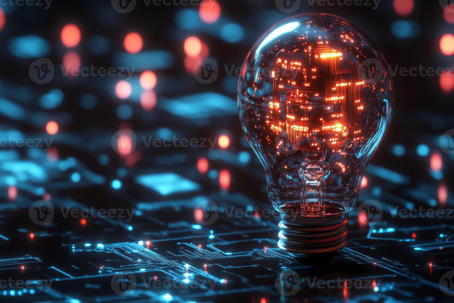 An innovative light bulb is exquisitely surrounded by a network of glowing circuitry, elegantly symbolizing the seamless fusion of advanced technology and soft illumination within a dark environment Pro Photo