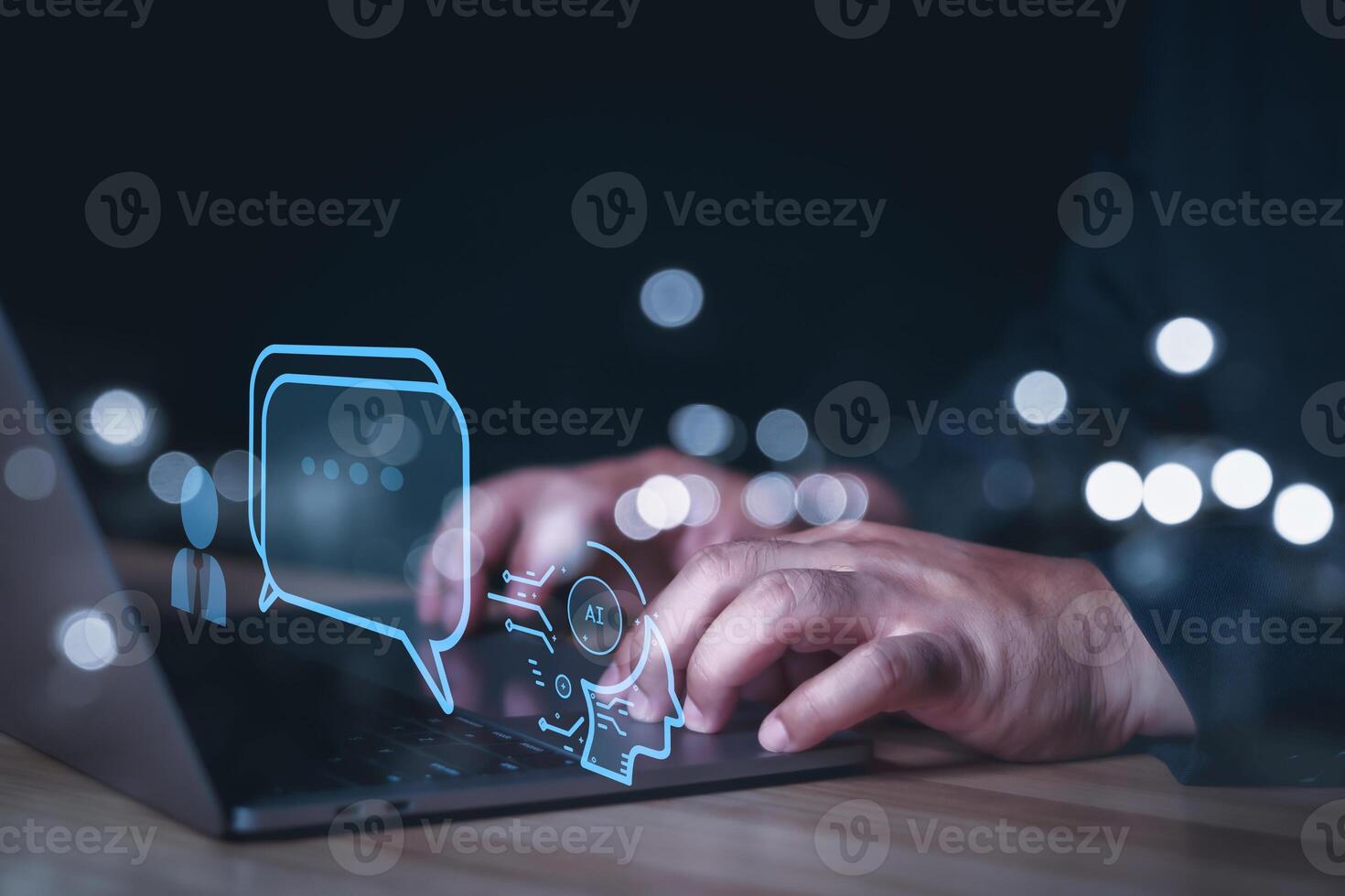 Chat with AI, Artificial Intelligence. man using technology smart robot AI, artificial intelligence by enter command prompt for generates something, Futuristic technology transformation. Pro Photo