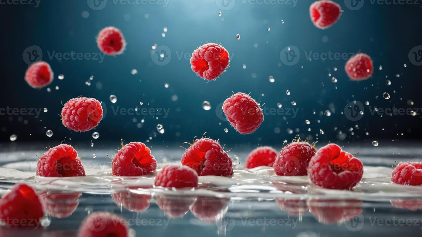 Fresh raspberries splashing in creamy liquid, creating a dynamic and appetizing scene. Pro Photo