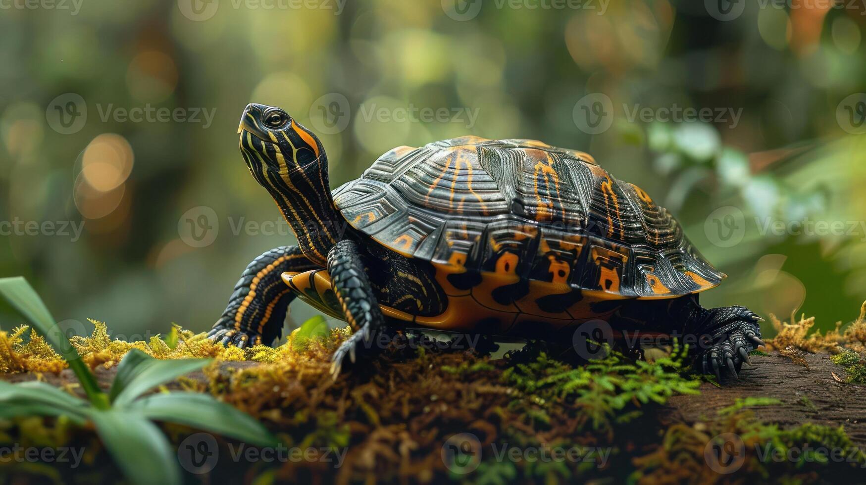 A snapping turtle with a vibrant patterned shell, resting on lush green moss and ferns in a jungle setting. Pro Photo