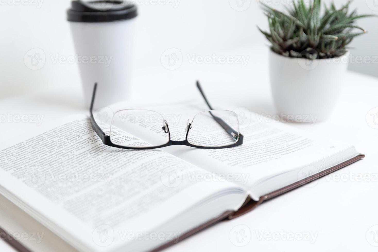 Open book with glasses resting on top, symbolizing reading, knowledge, study, and insight, representing concepts of learning, literature, wisdom, and intellectual exploration Pro Photo