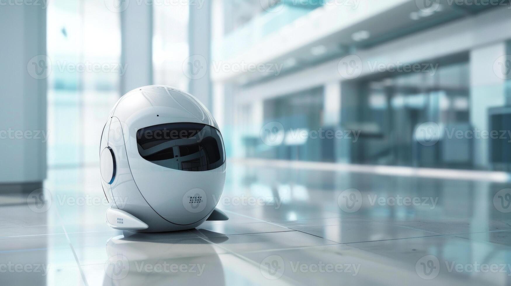A futuristic robotics project poster showcasing a compact service robot with smooth curves and a white and silver finish Pro Photo