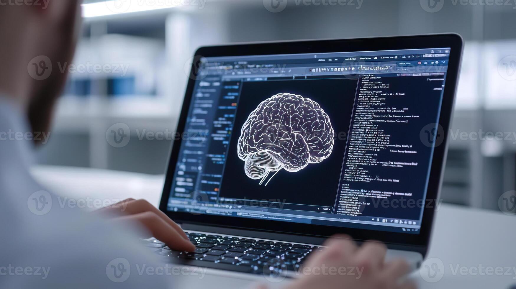 Businessman utilizing AI technology for data analysis, coding on a laptop with a digital brain interface. Pro Photo