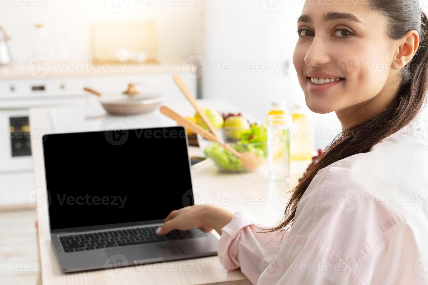 Portrait of happy smiling young lady using personal computer with black empty screen for mock up design, looking back sitting at dinner table in kitchen, working and typing on keyboard Pro Photo