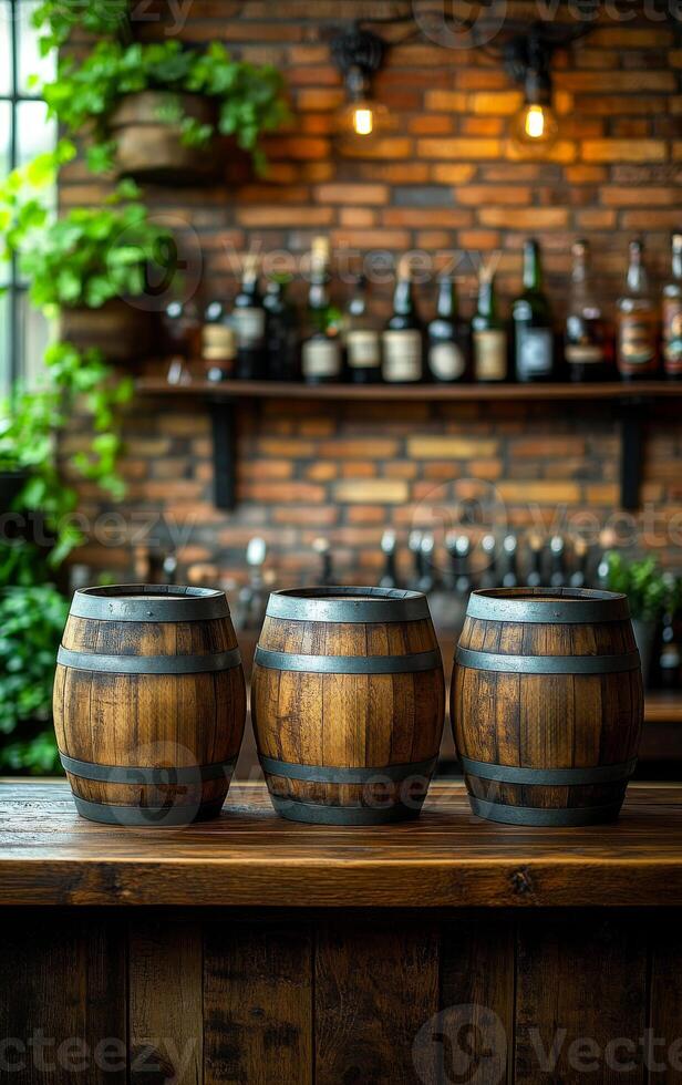 Three barrels of wood sit on a counter in front of a brick wall. The barrels are wooden and have a rustic appearance. The scene is set in a bar, with bottles Pro Photo