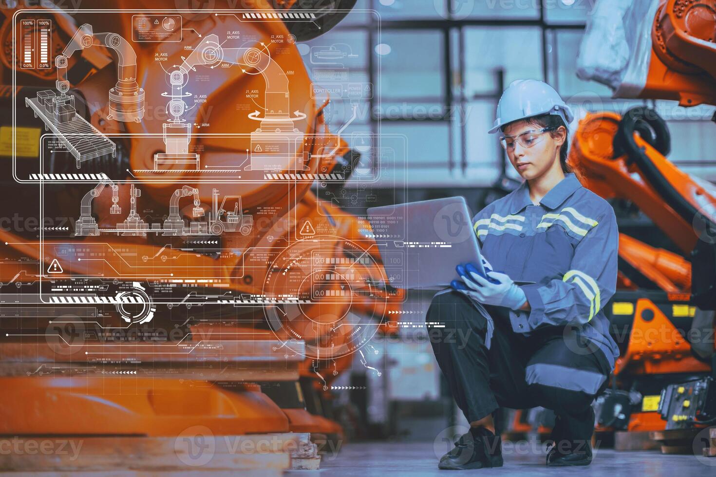 Engineer Staff Using Laptop Computer Technology Software Program Robot In Robotic Industry Factory overlay modern graphics HUD. Pro Photo