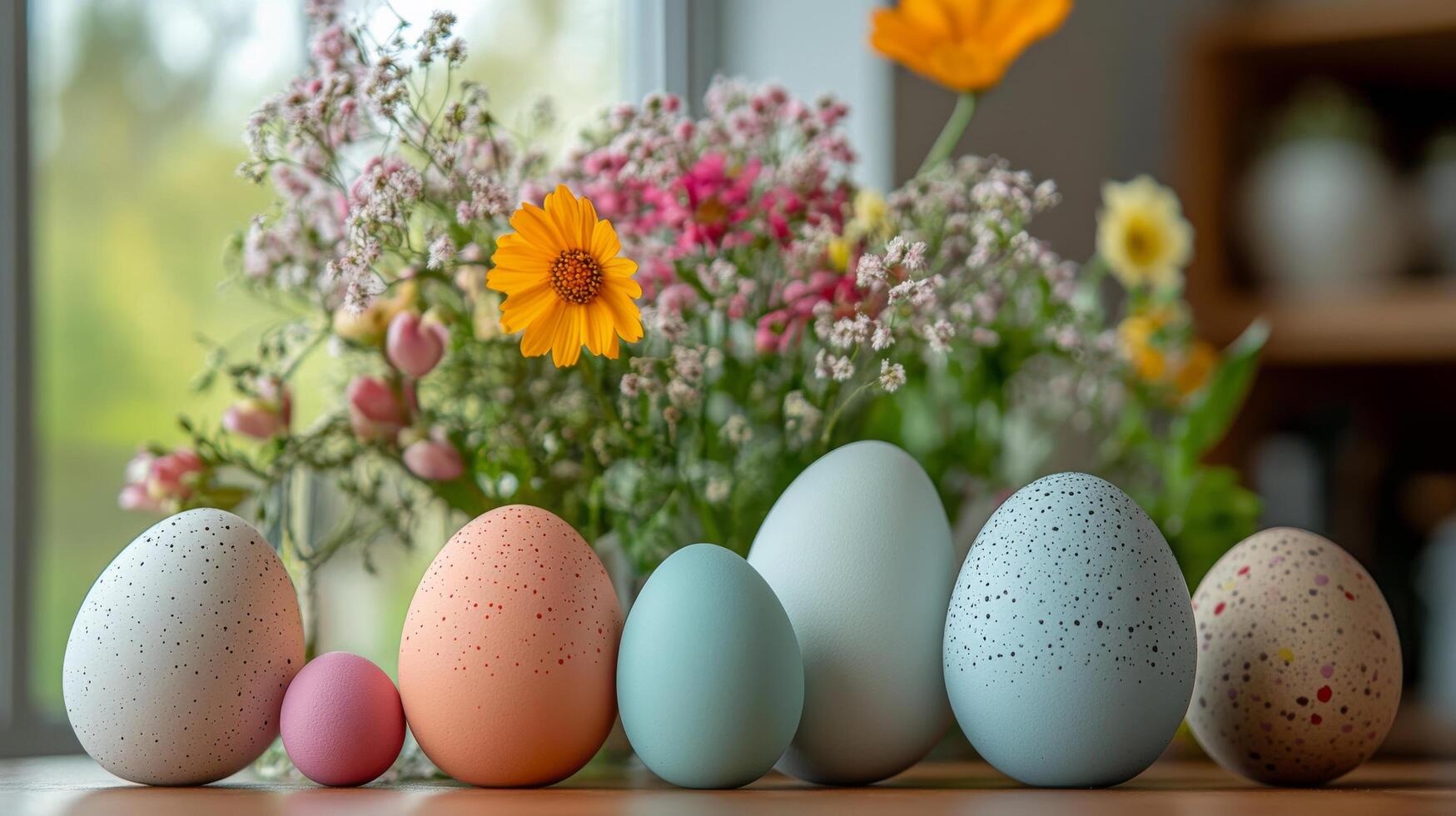 Decorative Easter eggs arranged on a table with flowers and greenery in a bright setting Free Photo