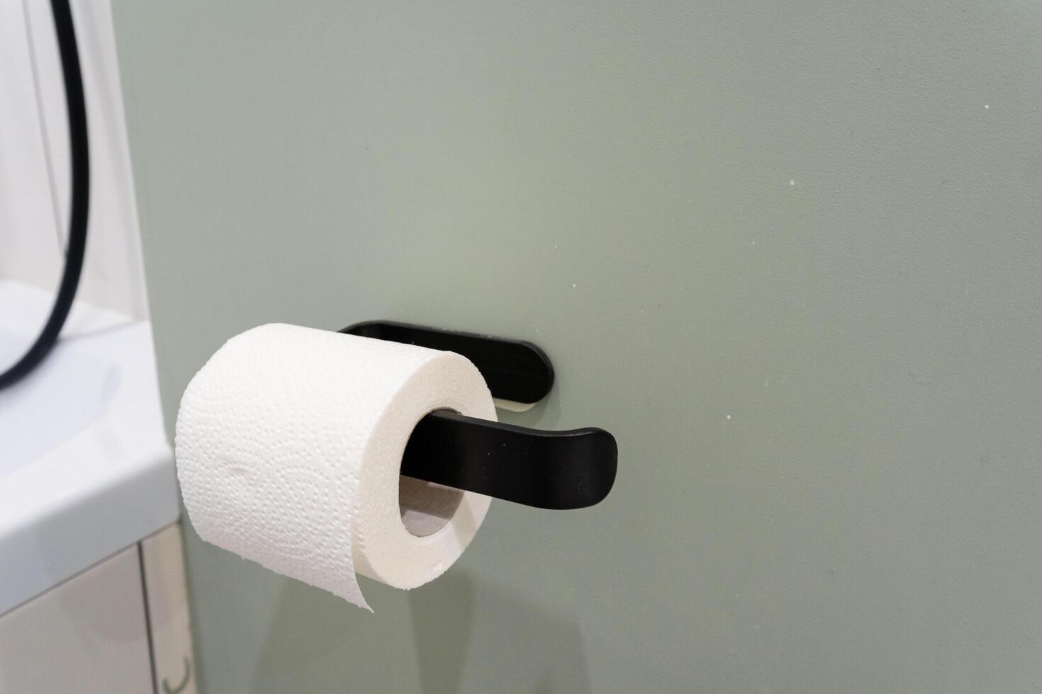 In an organized and wellarranged bathroom, a sleek black holder elegantly displays a single roll of toilet paper, ensuring that it is easily accessible for immediate use whenever needed photo