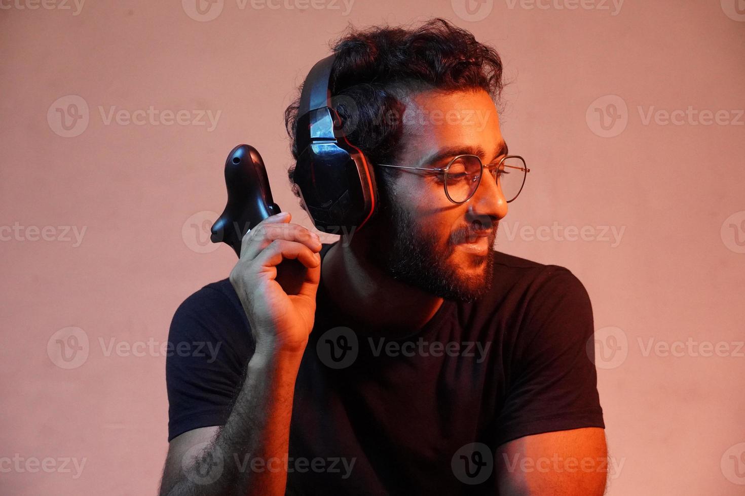 yong man with playing game's Joystick and wearing headphone Pro Photo
