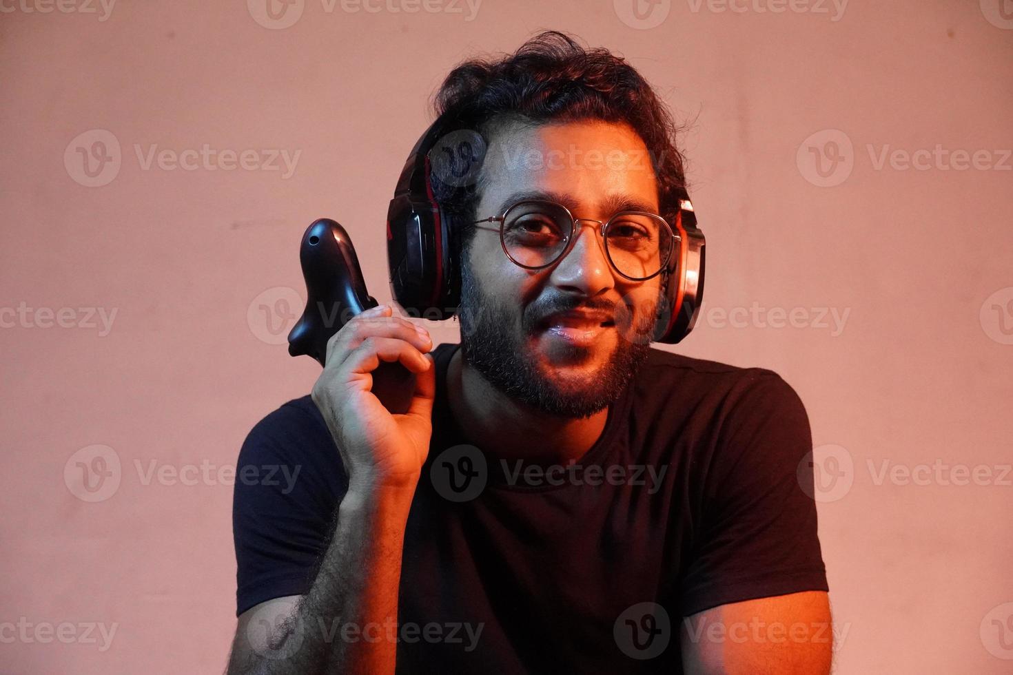 yong man with playing game's Joystick and wearing headphone Pro Photo