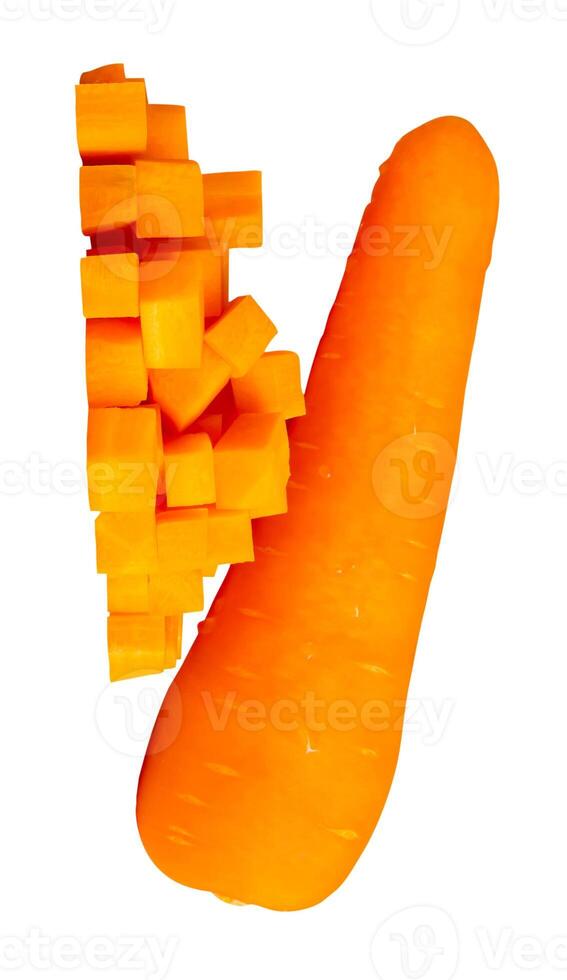 Top view of orange carrot roots with slices or pieces in cube shape in stack isolated on white background with clipping path Pro Photo