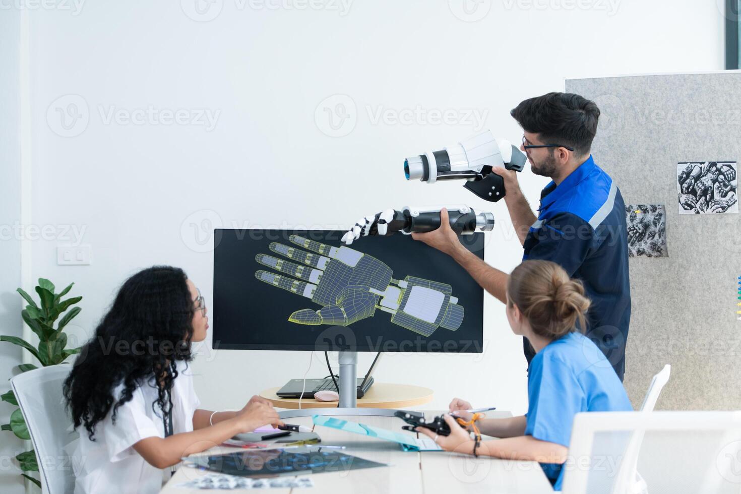 Engineers, doctors and physical therapists brainstorm ideas to design a robot with arm and hand organs, To be utilized for additional testing on patients. Pro Photo