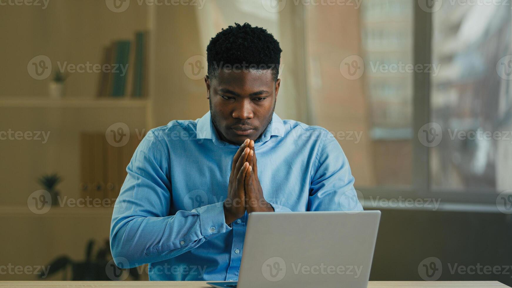 Desperate sad angry African American businessman manager entrepreneur working with laptop at office has computer problem broken device send wrong email message bad news or crash mistake error failure Pro Photo