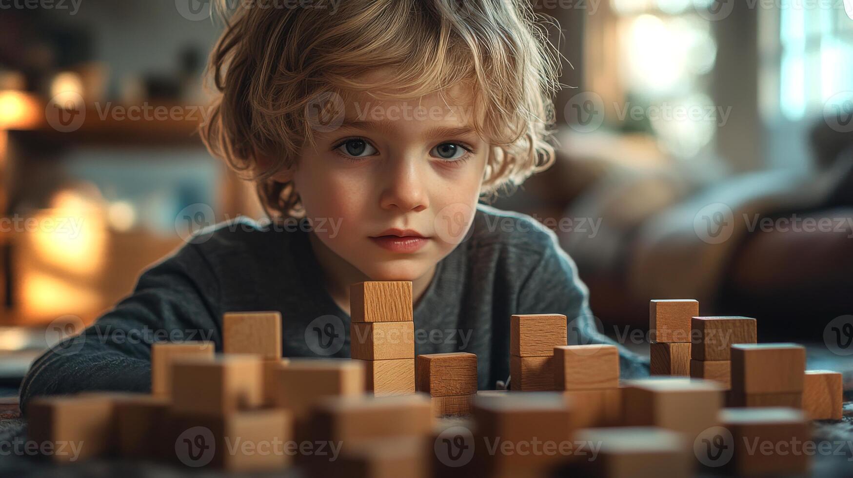 A young child intently constructs a structure using wooden blocks on a soft surface. Natural light streams in, creating a warm and inviting atmosphere. Pro Photo