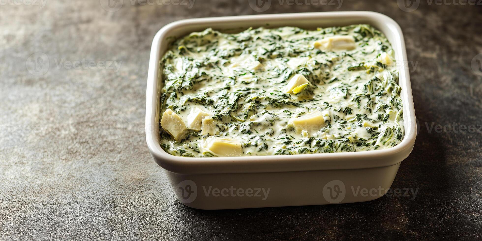 Spinach artichoke dip displayed in a rectangular container with even texture, gastronomy photography Pro Photo