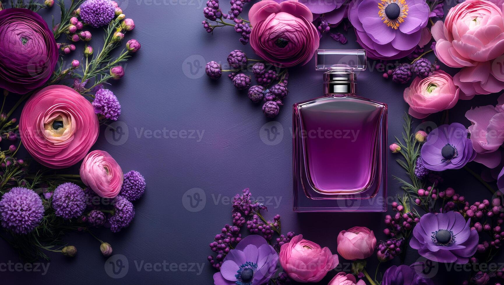 A bottle of perfume is surrounded by purple flowers. The flowers are arranged in a way that they complement the bottle and create a visually appealing display. Scene is elegant and sophisticated Pro Photo