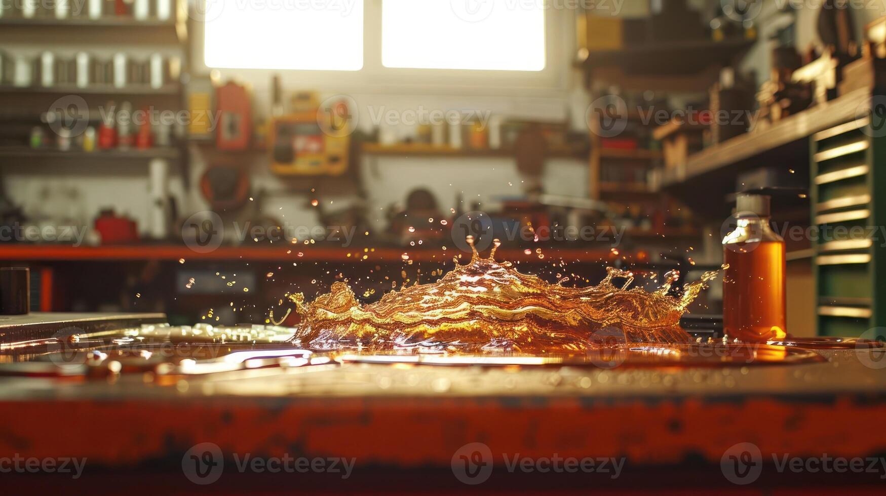 A splash of liquid on a workbench in a workshop, capturing motion and texture. Pro Photo