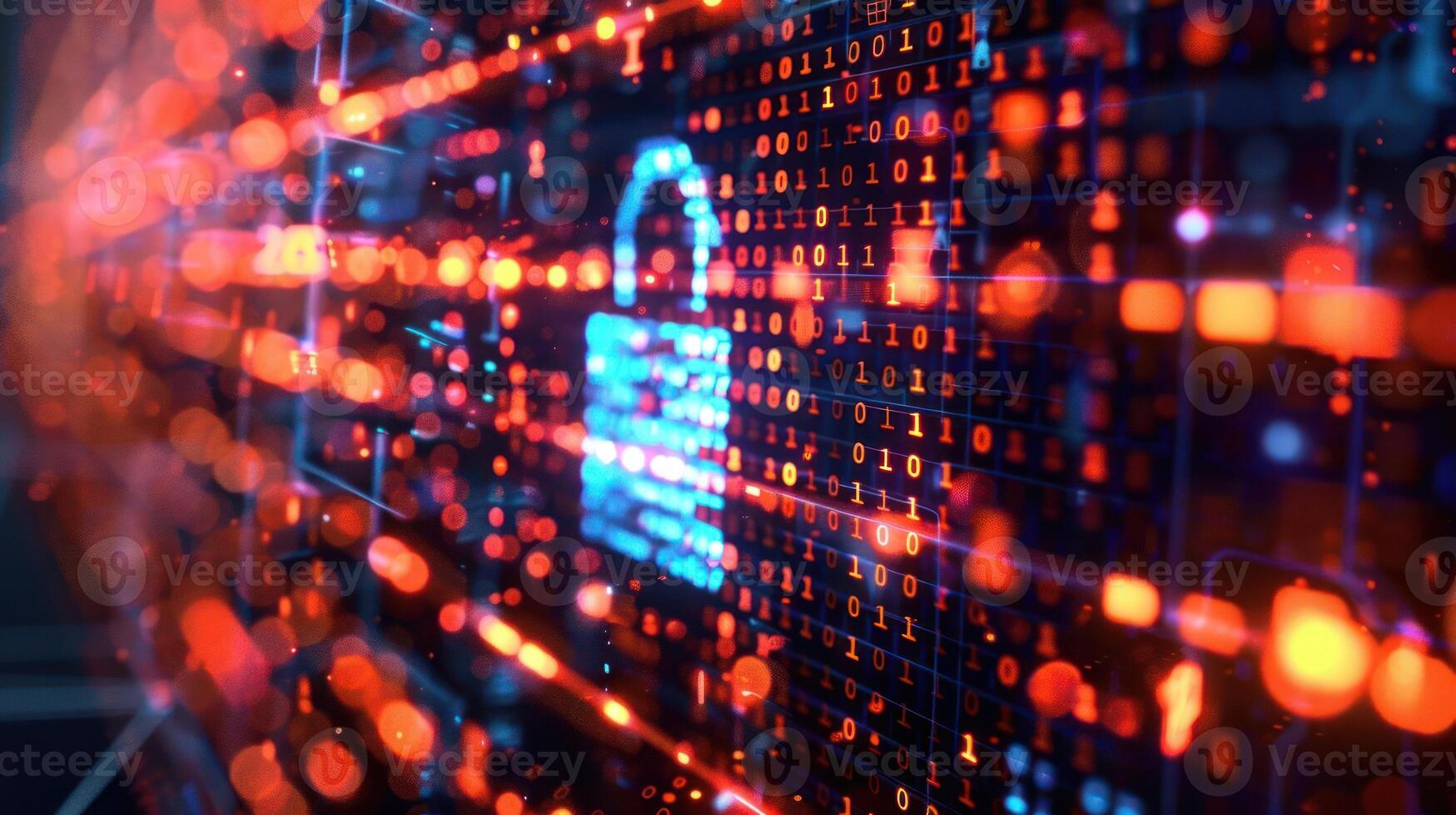 Digital representation of cybersecurity with a padlock and binary code. Pro Photo