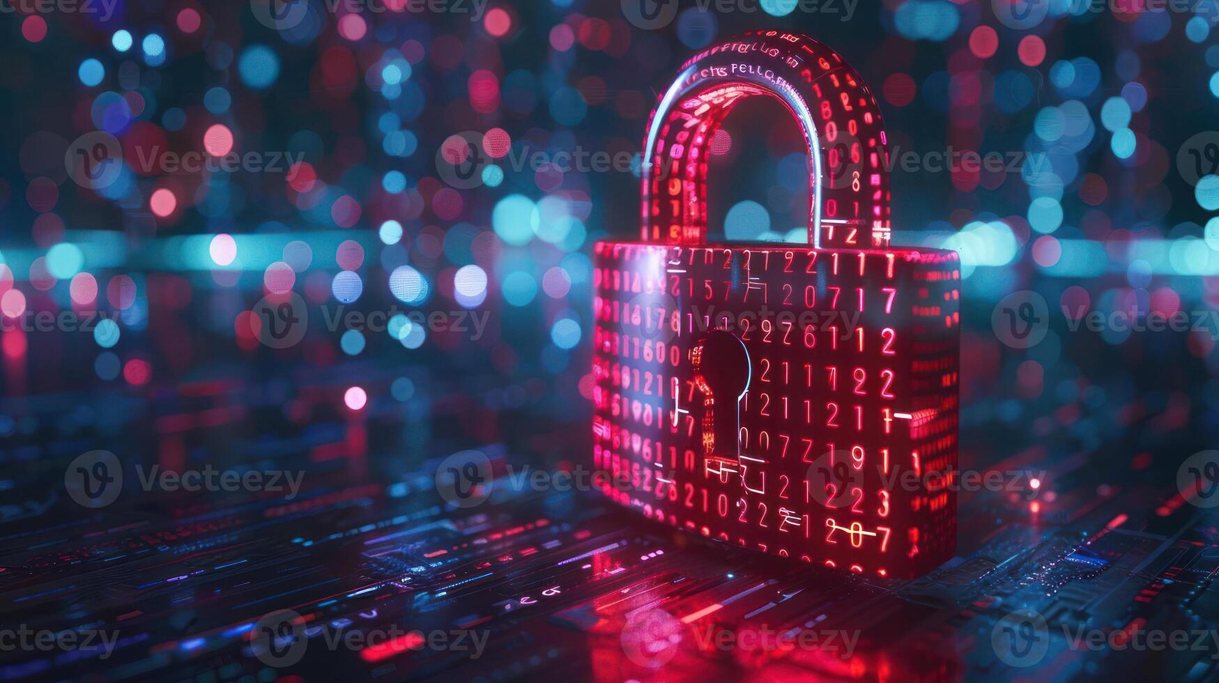 A digital padlock surrounded by binary code, symbolizing cybersecurity and data protection. Pro Photo