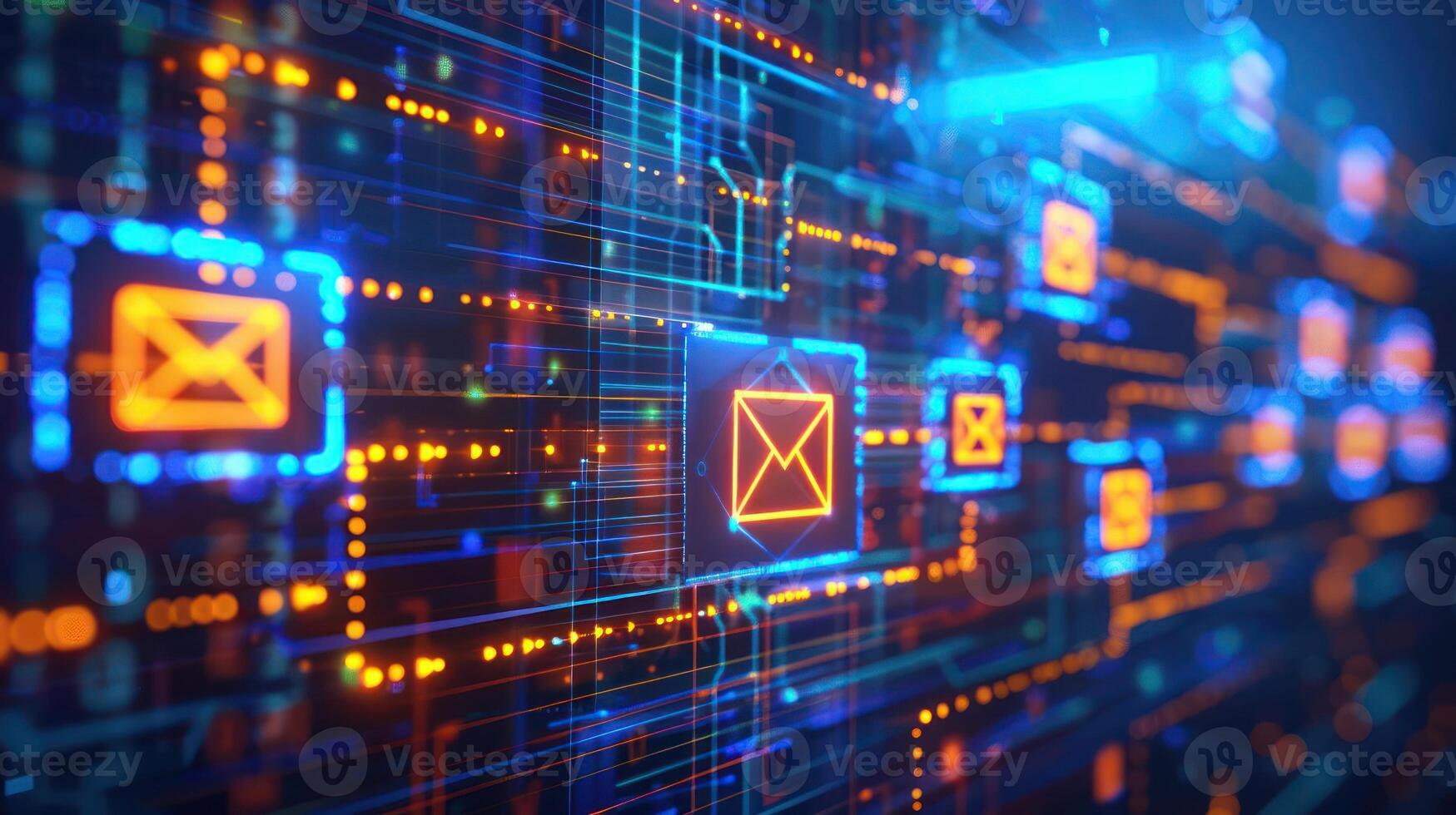 Digital network with glowing email icons and circuitry, symbolizing communication technology. Pro Photo