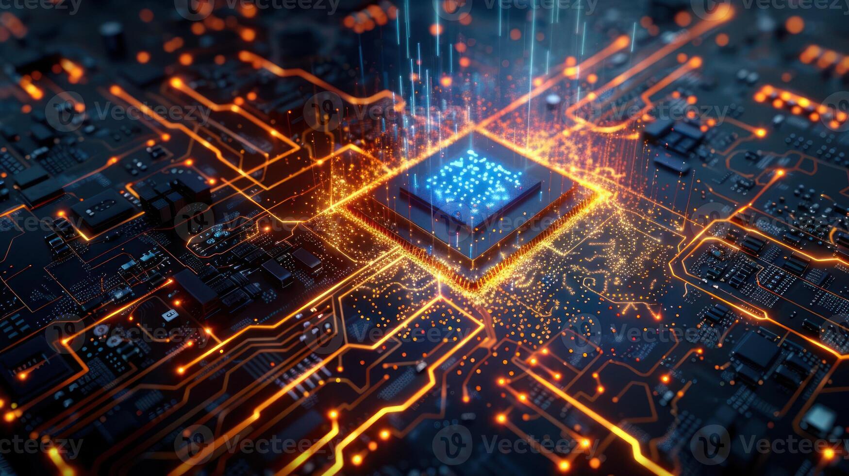 A close-up view of a computer chip with glowing circuits and data streams. Pro Photo