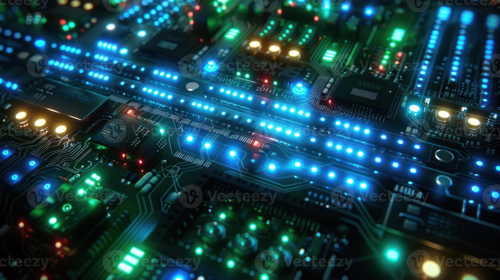A close-up view of a circuit board illuminated by colorful LED lights, showcasing technology. Pro Photo