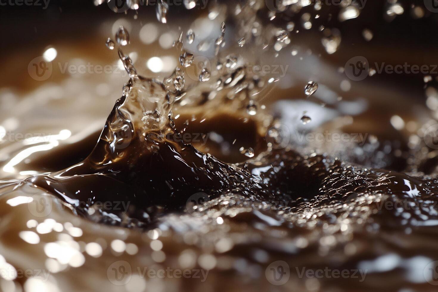 Close-up of coffee splashing, creating dynamic ripples and droplets. Pro Photo