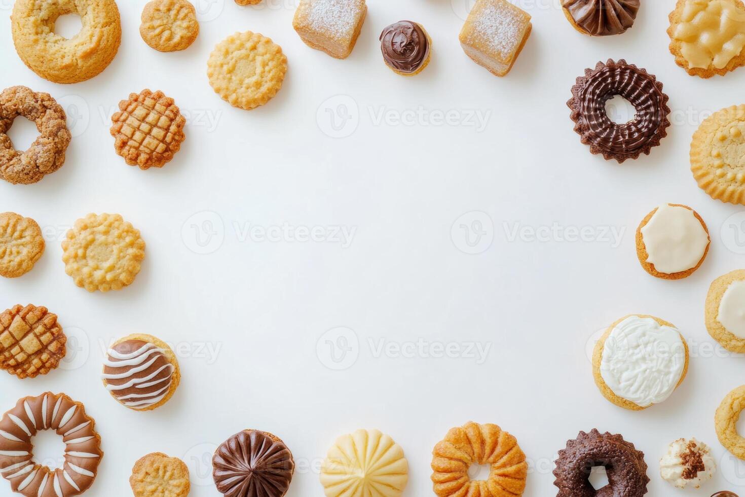 An assortment of cookies and sweets displayed on a clean white background, featuring various shapes and flavors with room for custom text. Pro Photo