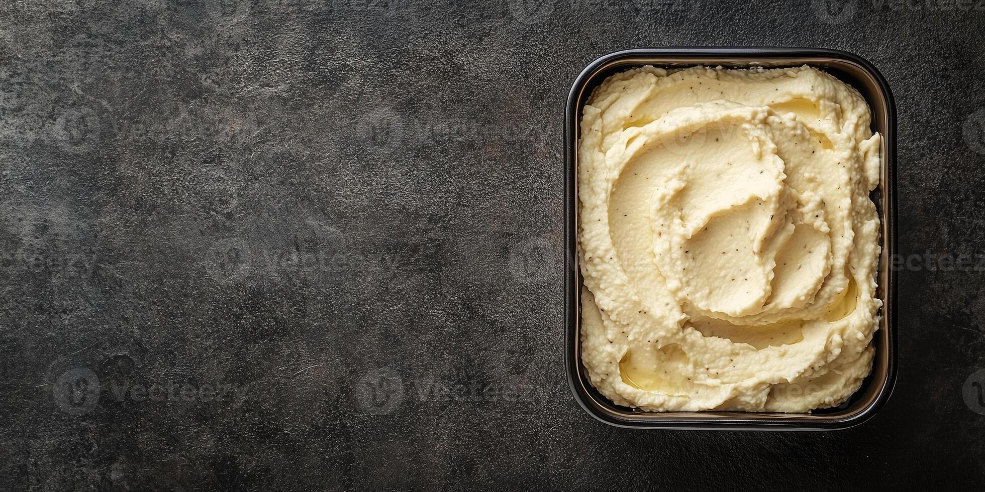 Hummus displayed in a rectangular container with an even texture and no extra components, photorealistic food Pro Photo
