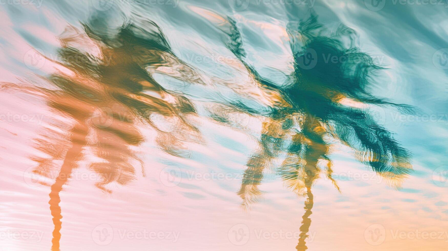 Blurred palm reflections in shallow water, soft ripples and abstract light. Blurred view sandy beach palms Pro Photo