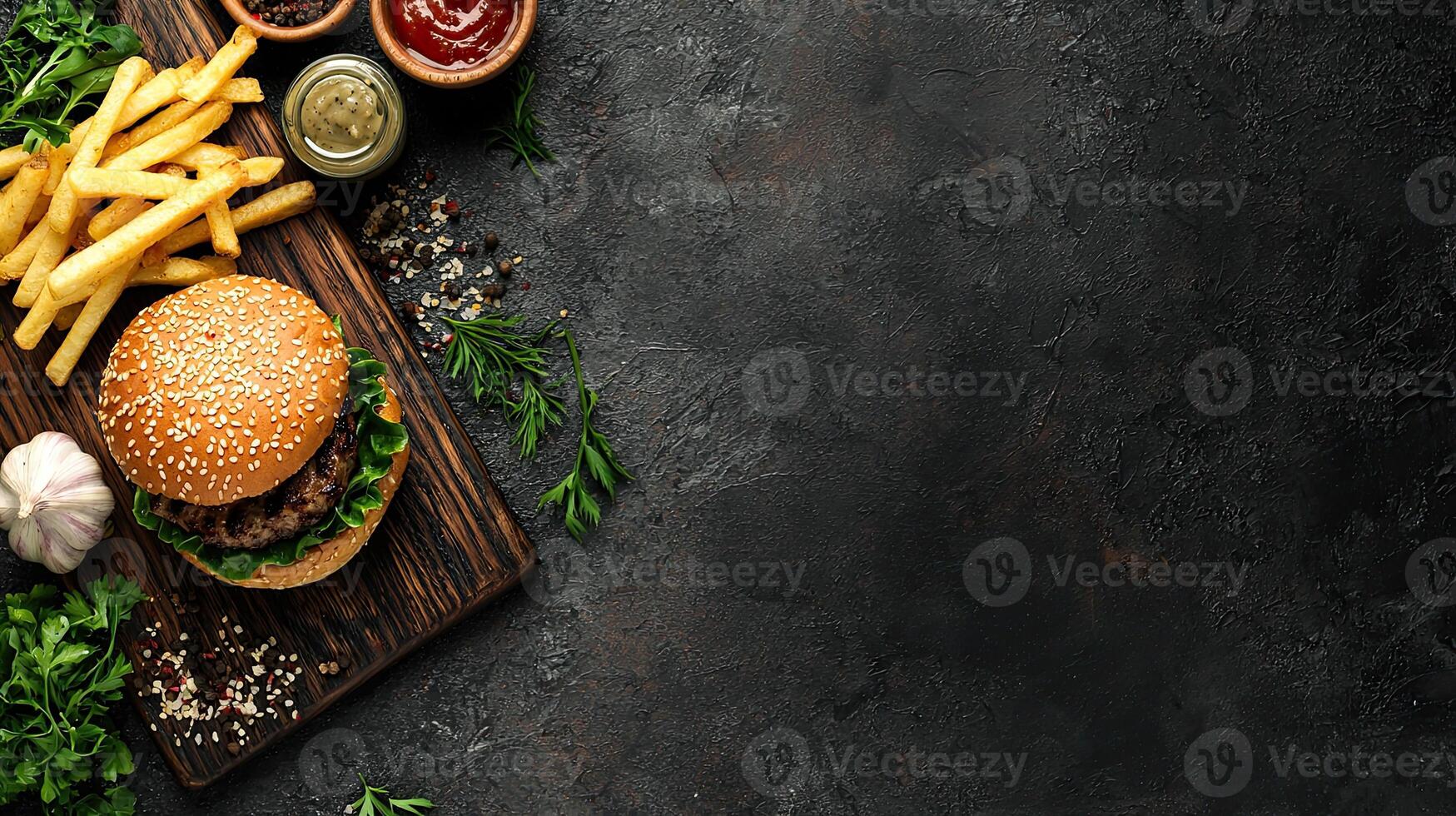 hamburger with fries on a wooden board against a dark background, with space for text and elements of garlic Pro Photo