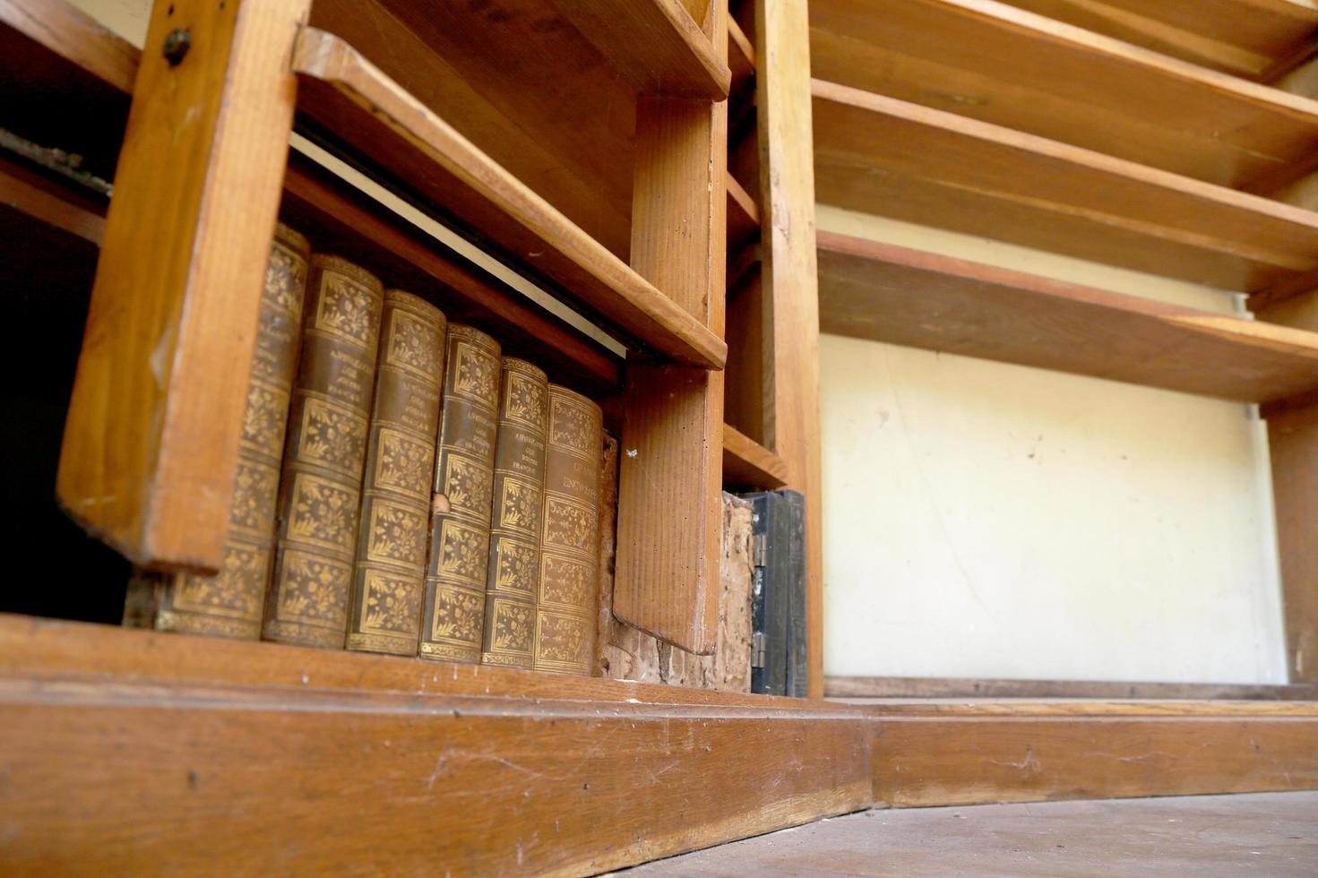Personal library consisting of big empty bookcase with wooden bookshelf for books photo