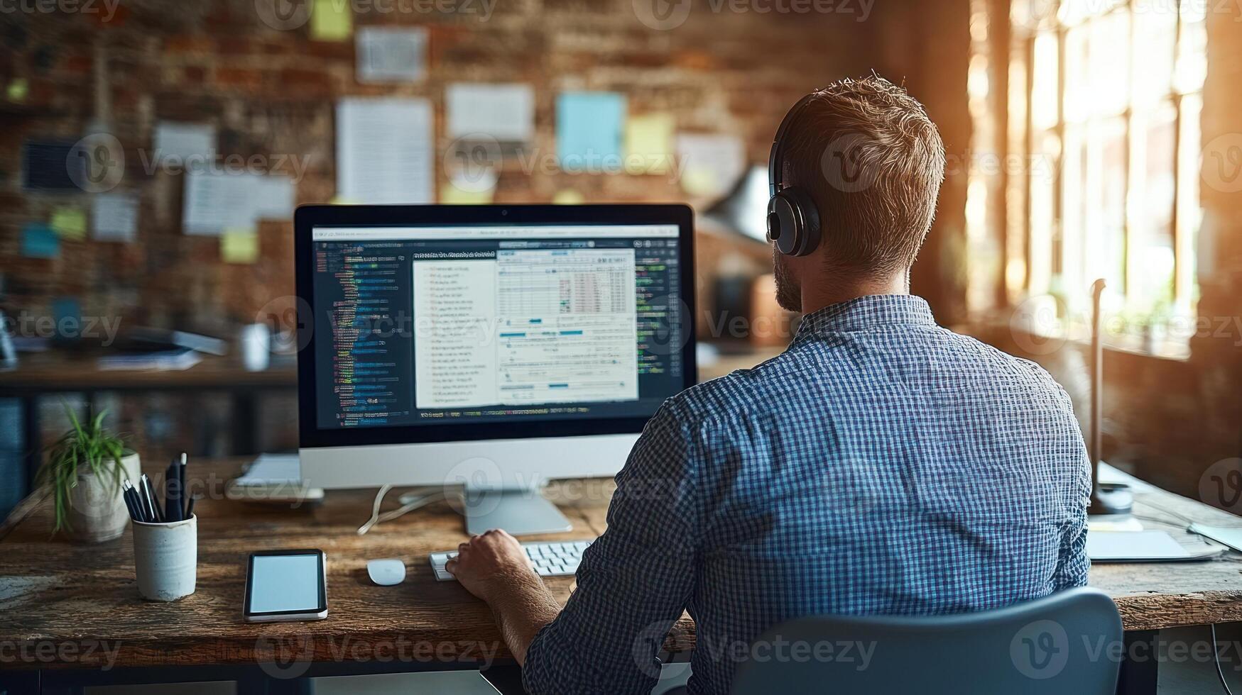 Individual sits at a wooden desk, working intently on programming tasks with a computer screen Pro Photo