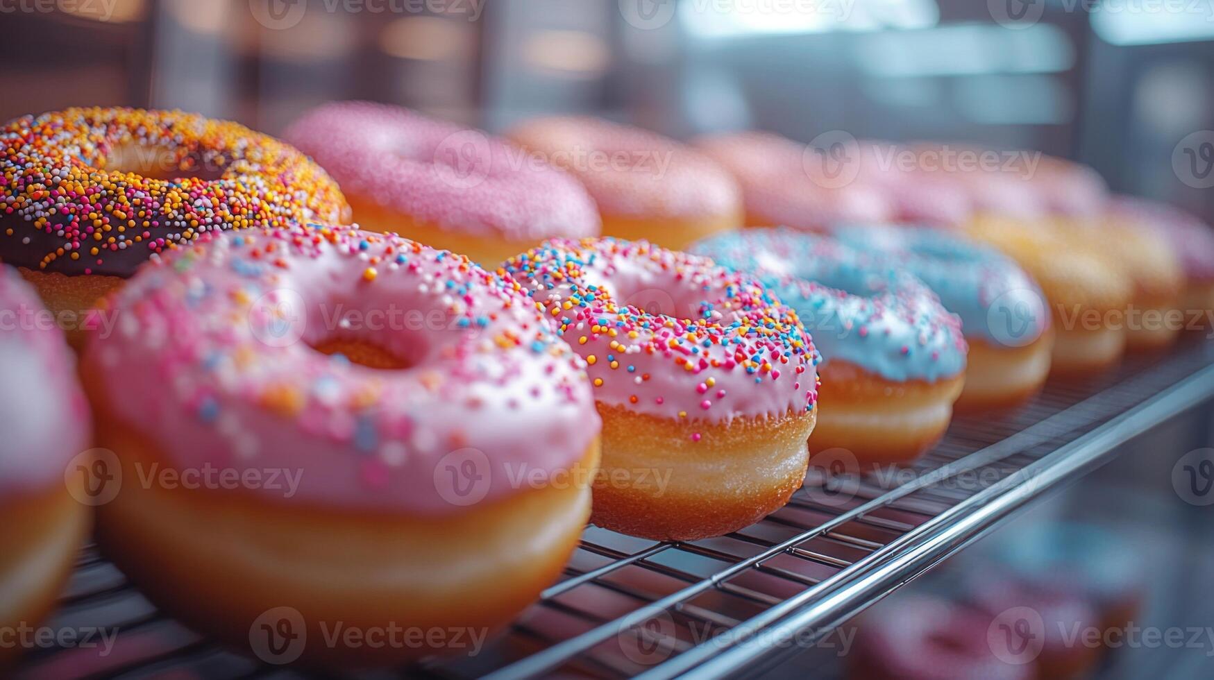 A tempting array of donuts lines a display rack in a bakery. Pro Photo