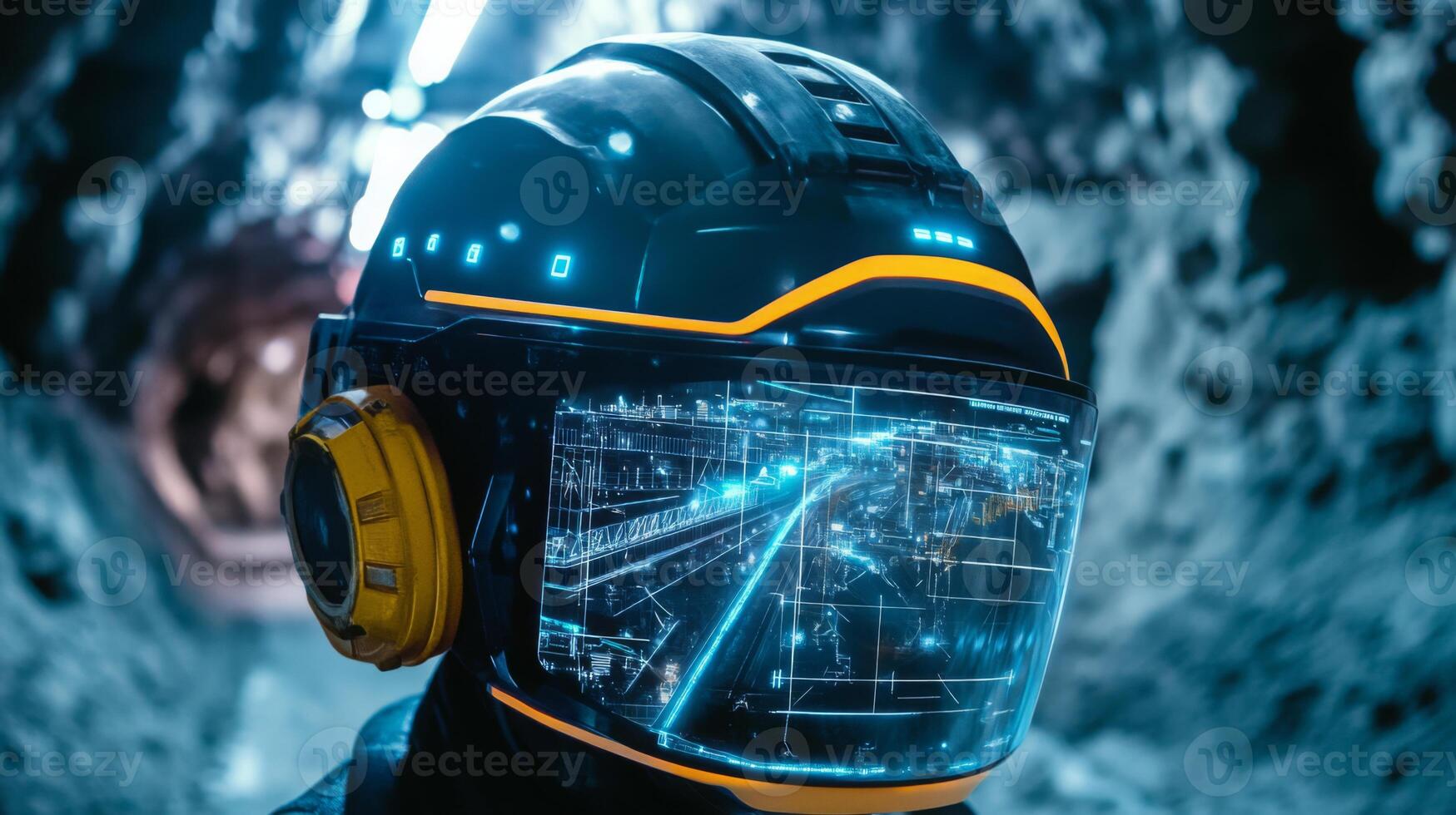A miner equipped with a high-tech helmet investigates a gemstone-rich tunnel, utilizing ai tools for data analysis and exploration. Pro Photo