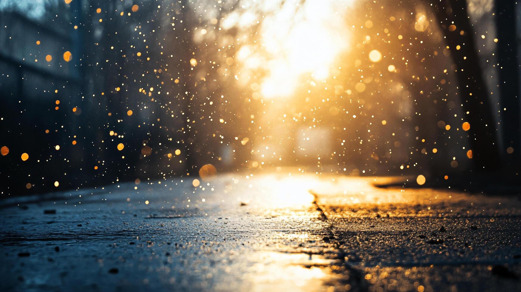 Blurry image of a wet road with raindrops and a sun in the background. Scene is serene and peaceful, as the raindrops create a calming effect and the sun adds a warm glow to the scene photo