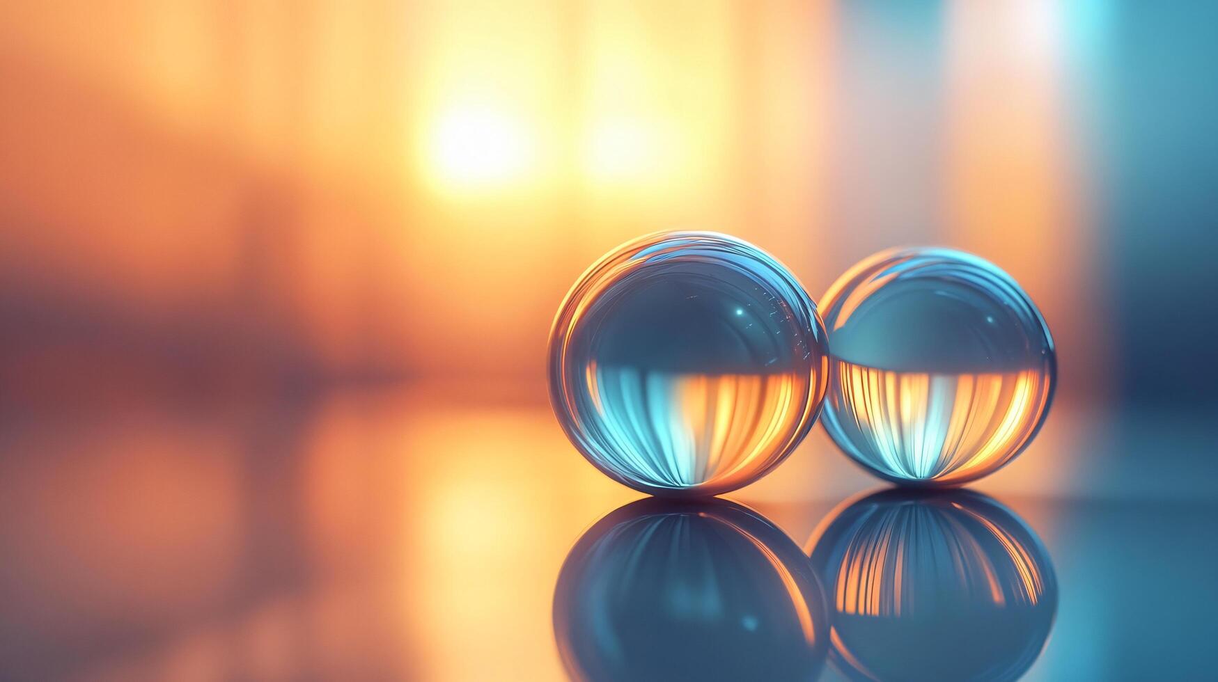 Two large, clear spheres are reflected in a mirror. The spheres are positioned close to each other, creating a sense of unity and harmony. The mirror's reflection adds depth and dimension to the scene photo