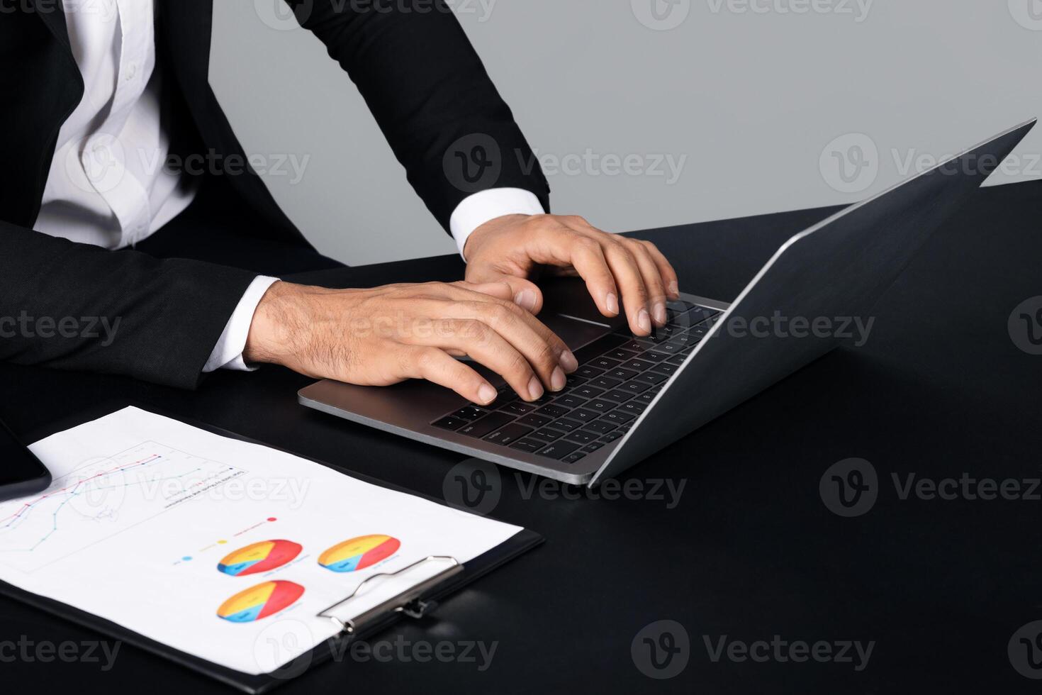 Unrecognizable man in business attire is focused on his laptop, analyzing data. Nearby, a document with colorful pie charts is neatly arranged on the table. Pro Photo